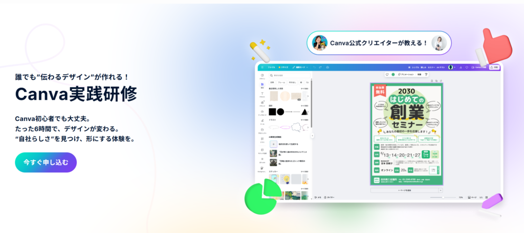 Canvaはテンプレートが豊富でAI機能とも連携できるため、デザインスキルに自信がない方でも、見栄えの良い資料を作成できます。表現の幅を広げたい、より効率的に資料を作りたいと考えている方にとって、本研修は非常に有意義な機会となるでしょう。