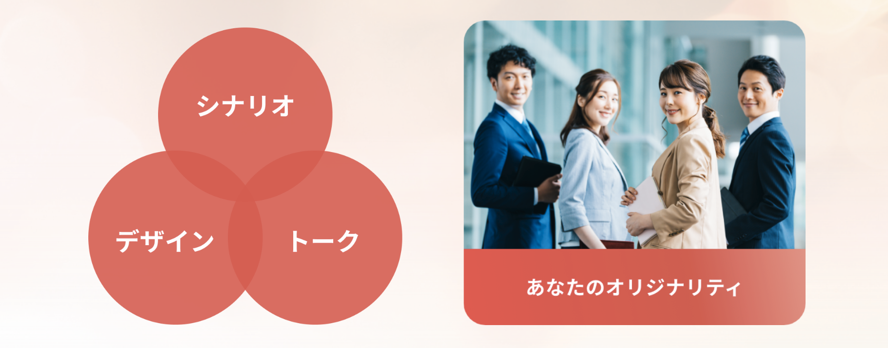 シナリオ・デザイン・トークの3要素を徹底網羅 〜 単に上手な話し方を学ぶのではなく、 話の組み立て方(シナリオ)、資料の作成方法(デザイン)、あなたらしい話し方(トーク)を 体系的に学べる唯一無二のカリキュラムを提供します。